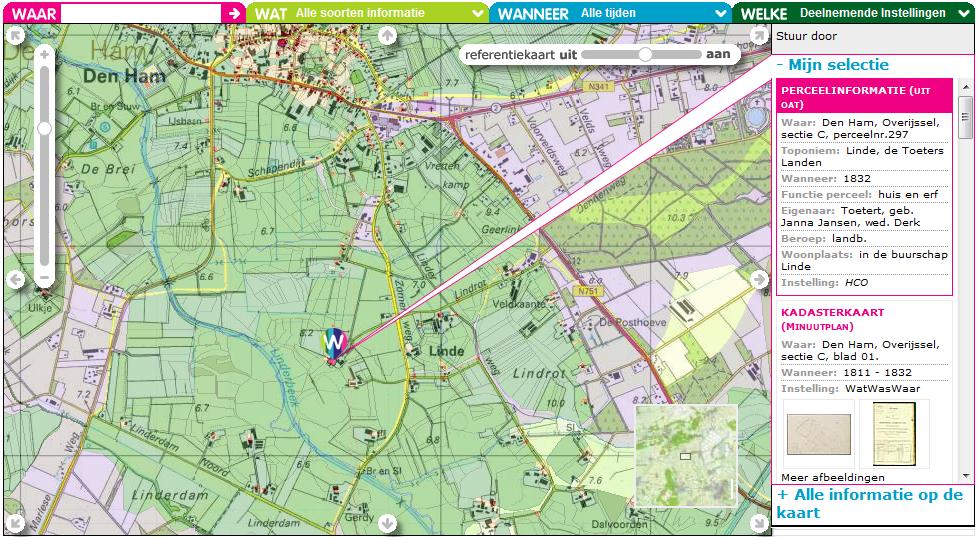 Landbezit Derk Toetert (1750-1817) en Janna Jansen (plm 1772- 1837)Derk Toetert was in 1817 overleden. De percelen staan daarom op naam van weduwe Janna Jansen. Derk en Janna woonden in de buurtschap Linde (ten zuiden van het kerkdorp Den Ham). Onderstaande kaart laat een gecombineerde kaart zien waarin de oude kaart van 1832 is geprojecteerd op een recente kaart zodat de huidige locatie eenvoudig is terug te vinden.