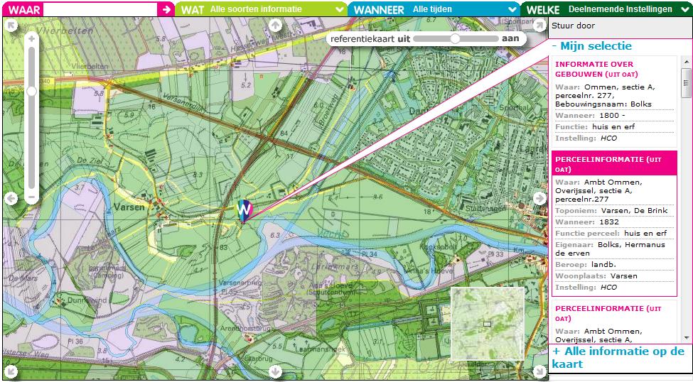 Landbezit Hermannus Bolks (1775-1839) en Geertje Bouwhuis (1778-1815)Hermannus Bolks en Geertje Bouwhuis hadden hun boerderij in Varsen (een buurtschap ten westen van Ommen). Onderstaande kaart laat zien waar de boerderij gevonden kan worden op een gecombineerde kaart waarin een recente kaart over de kadastrale kaart van 1832 gelegd is. Geertje Bouwhuis was al in 1815 op 37 jarige leeftijd overleden op 17 maart (twee weken na de bevalling van haar jongste dochter Antje, 4 maanden later overlijdt ook Antje).