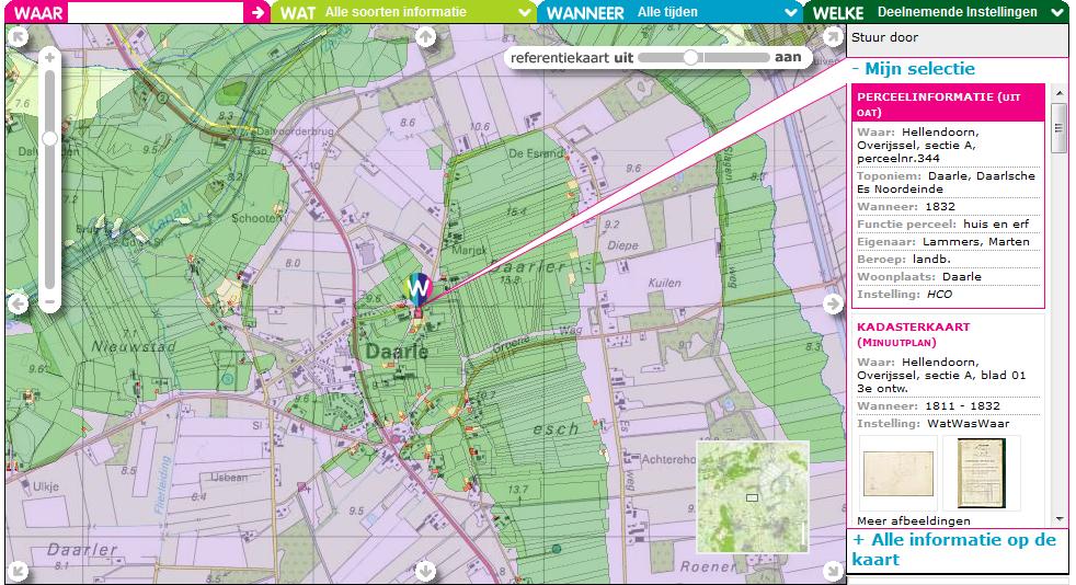 Landbezit Marten Nijman (1782-1857) en Jennigjen Lambers (1789-1859)Marten Nijman en Jennigjen Lambers (ook wel Lammers genoemd) woonden in Daarle. Het erve Nijman in Daarle wordt in 1832 bewoond door en is bezit van Martens oudste broer Jan. Marten trouwt met zijn huwelijk in op het Lammers. Ook in 1832 wil het nog wel eens voorkomen dat de achternaam verbonden wordt aan de boerderij want Marten krijgt in het kadaster de achternaam Lammers. Onderstaande kaart laat zien waar het Lammers gevonden kan worden op een gecombineerde kaart waarin een recente kaart over de kadastrale kaart van 1832 gelegd is.