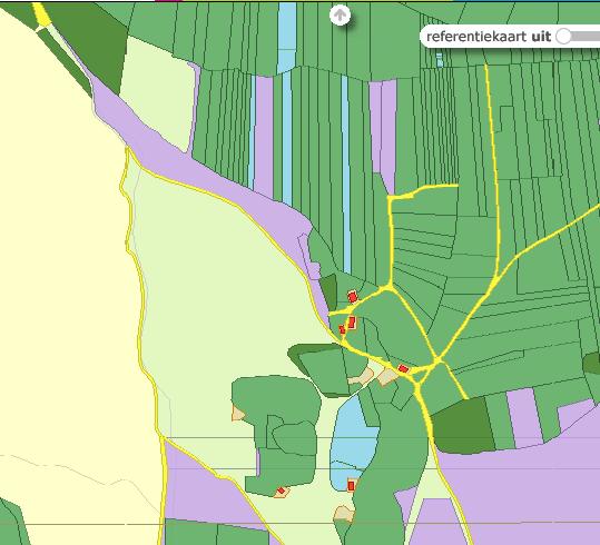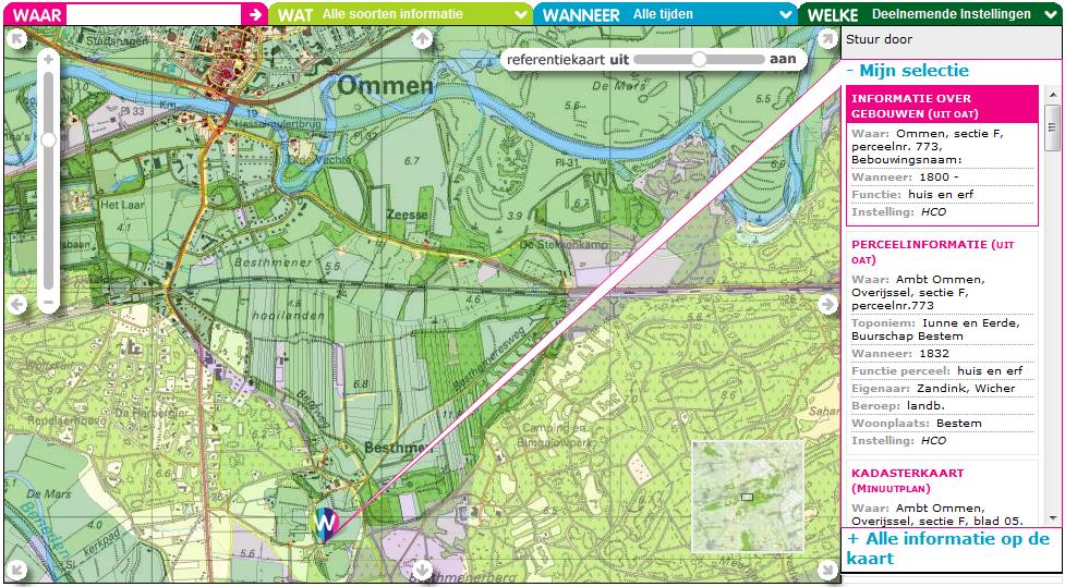 Hieronder is in lichtblauw aangegeven welke percelen aan Wicher Zandink toebehoorden. Naast de twee percelen vlakbij zijn boerderij heeft hij ook een zestal langgerekte percelen in de Besthemer hooilanden. In totaal bezat Wicher 5 ha bouwland en 1,5 ha hooiland naast huis en erf..