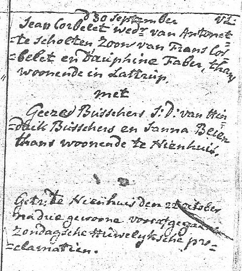 Voor details over de voorvaders van Jean Corbolet zie Voorouders Jean Corbolet De namen Corbolet, Corbelet, Korbelet komen in Nederland niet meer voor. Jean Corbolet was Rooms-Katholiek. We zien zijn 4 huwelijken dan ook opgetekend in RK trouwboeken. Zijn tweede huwelijk is opgetekend in het RK Trouwboek van Ootmarsum 1727-1811. Dit huwelijk staat echter ook ingeschreven in het NG Trouwboek Ootmarsum 1733-1795 (NG = Nederduits Gereformeerde kerk, indertijd de officiële naam van de Hervormde Kerk). Dat had te maken met het feit dat Rooms-Katholieken in die tijd gedwongen waren hun huwelijken (ook) op te laten tekenen door hervormde predikanten. huwelijken en kinderen:
