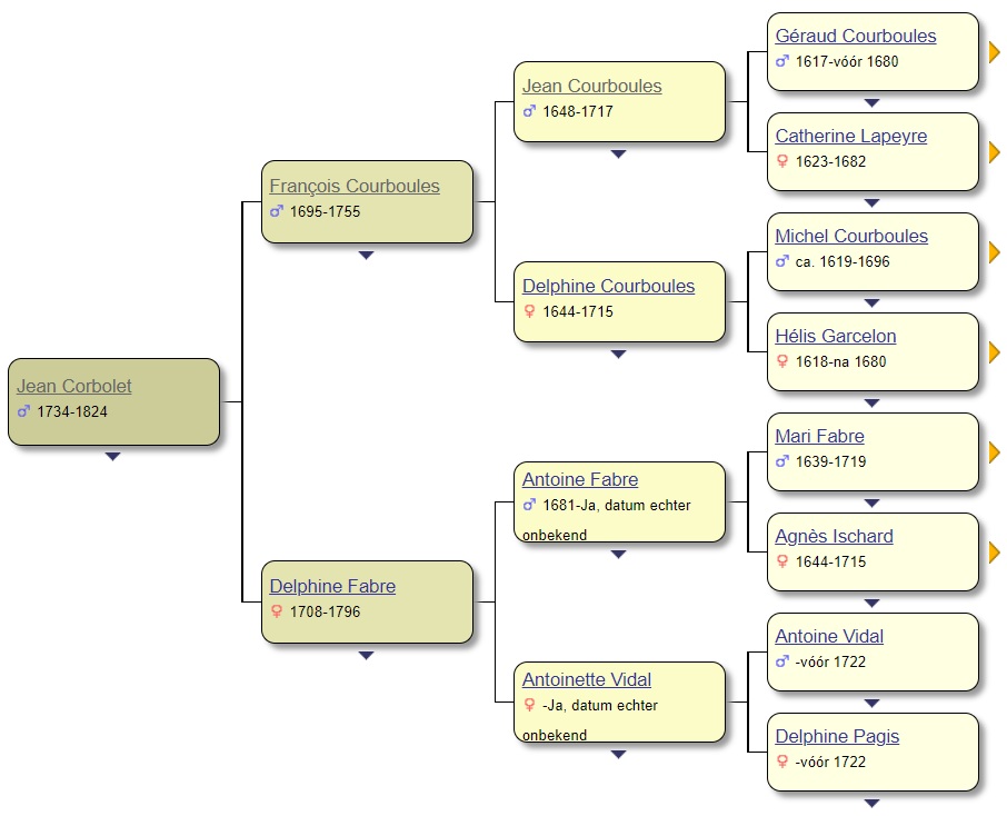 De ouders van François Courboules (1695 - 1755) zijn: Jean Courboules en Delphine Courboules (ook cultivateur (landbouwer) in de buurtschap Pailhès). Er is (nog) geen familierelatie (geen gemeenschappelijke voorouders) tussen Jean en Delphine gevonden. De ouders van Jean Courboules (1648-1717) zijn Géraud Courboules (1617 - voor 1680) en Catherine Lapeyre (1623 - 1682) De ouders van Géraud Courboules zijn François Courboules (overleden voor 1634) en Elips Rongier (overleden ca 1623) Hieronder een overzicht van de eerste 4 generaties: